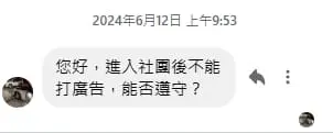 「您好,進入社團後不能打廣告,能否遵守?」