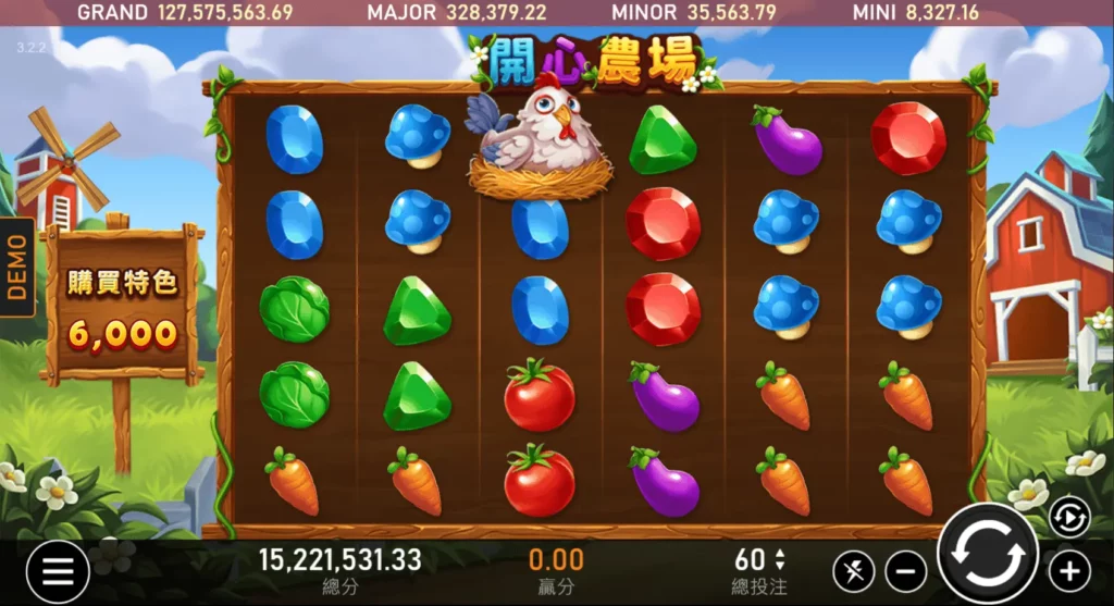 開心農場遊戲除了藉由消除符號來得分之外也可以觸發特色玩法使贏分翻倍。
